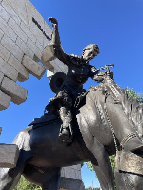 Earlier this year in July, Cheyenne Frontier Days (CFD) officials announced on the Cowboy Channel that the 2024 Cheyenne Frontier Days rodeo would be the Year of the Cowgirl. My reaction was great! I’m glad to see cowgirls getting some recognition, especially since cowgirls have been around as long as the rodeo itself. But CFD will also focus on the history of the cowgirl, and I thought it would be fun to get a jumpstart. With this idea in mind, I traveled to the American Heritage Center at the University of Wyoming in Laramie and happened to see their Breakin’ Through statue by D. Michael Thomas which “celebrates the accomplishments of Wyoming women in a larger-than-life statement.”1
